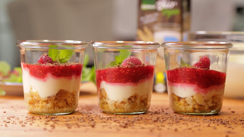 Für diese Küchlein brauchen Sie weder Zeit noch einen Backofen: Unser Rezept für No-Bake Cake im Glas wird mit einem Boden aus zerkrümelten Keksen zubereitet und ist mit einer Frischkäse-Füllung und einem Topping aus pürierten Himbeeren nach 15 Minuten im Kühlschrank verzehrfertig!