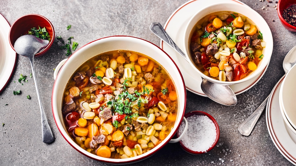 Weich gekochtes buntes Gemüse, geschmacklich unterstrichen durch ausgesuchte Gewürze, Rindfleisch und fruchtiges Sherry-Aroma – probieren Sie unser Rezept für Gemüsesuppe mit Nudeln aus.