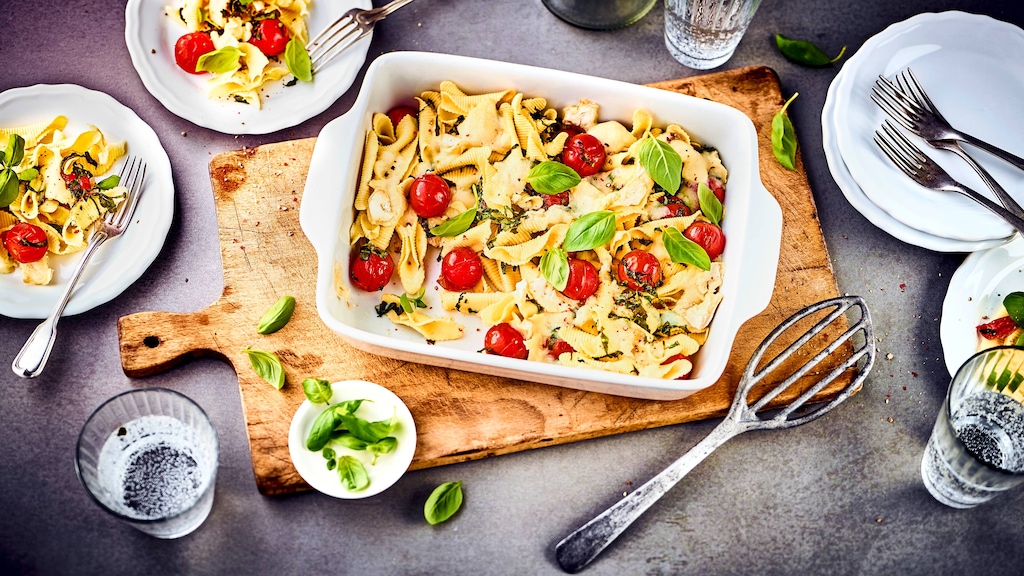 Unser Tipp für ein leckeres Pastagericht aus dem Ofen: Probieren Sie unser Rezept für Nudeln mit Cocktailtomaten, Ziegenkäse und Basilikum einmal aus – fertig in 45 Minuten!