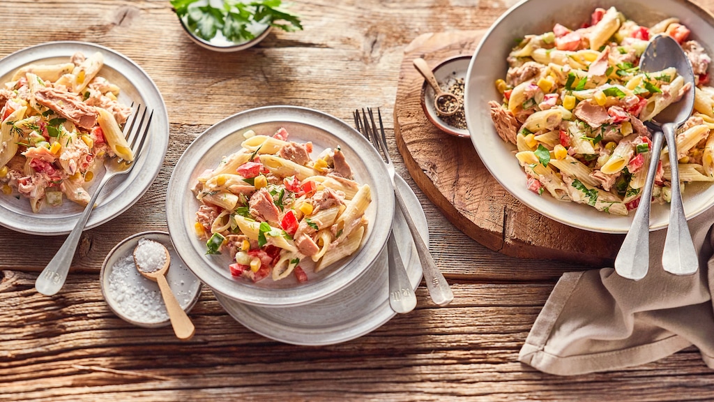 Unser Penne-Salat mit Thunfisch lässt sich auf vielfältige Weise abwandeln: Statt Paprika und Mais passen etwa auch Tomaten, Feta und Oliven oder zwei Handvoll Rucola und geröstete Pinienkerne. Wenn Sie zum Barbecue frischen Thunfisch grillen, können Sie auf den Dosen-Thunfisch im Nudelsalat verzichten und ihn rein vegetarisch dazu servieren. Eine weitere Alternative: Bereiten Sie den Nudelsalat mal mit gedünstetem oder angebratenem Lachsfilet zu!