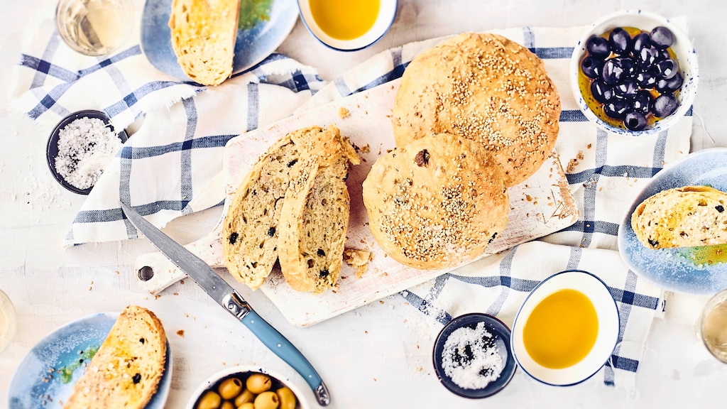 Mit unserem Olivenbrot-Rezept entführen wir Sie kulinarisch nach Zypern, wo das mediterrane Klima Olivenbäume bestens gedeihen lässt. Zum Backen des köstlichen Brotes brauchen Sie keine besonderen Vorkenntnisse mitzubringen – nur etwas Zeit, die der Hefeteig benötigt, um locker aufzugehen. Angerührt aus Mehl, Trockenhefe und lauwarmem Wasser, wird der Teig zunächst mit fein gehackten Zwiebeln, Rosmarin, Minze und Olivenöl und abschließend mit fein gewürfelten Oliven verfeinert. Alternativ können Sie auch getrocknete Tomaten verwenden, was zu einem ebenso leckeren Ergebnis führt. Nach einer Ruhezeit werden daraus zwei Brotlaibe geformt, die mit Wasser bestrichen und mit Sesam bestreut etwa 40 Minuten im Ofen backen. Lassen Sie die duftenden Brote erst etwas auskühlen und reichen Sie dann am besten Antipasti und mediterrane Aufstriche wie unsere würzige Fetacreme oder Zaziki dazu! Das Olivenbrot nach unserem Rezept schmeckt außerdem hervorragend zu Eintopfgerichten und Gegrilltem.