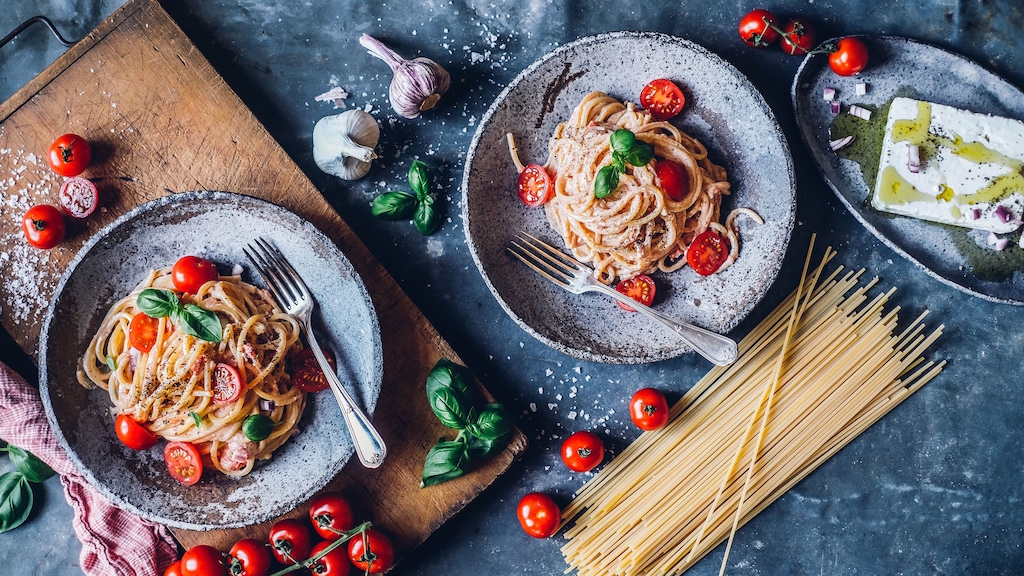 Nur zehn Minuten brauchen Sie für die Zubereitung der One-Pot-Pasta mit Tomate und Feta. Und während die Spaghetti im Ofen garen, können Sie in aller Ruhe den Tisch decken und – wenn Sie mögen – den Wein aufmachen!
