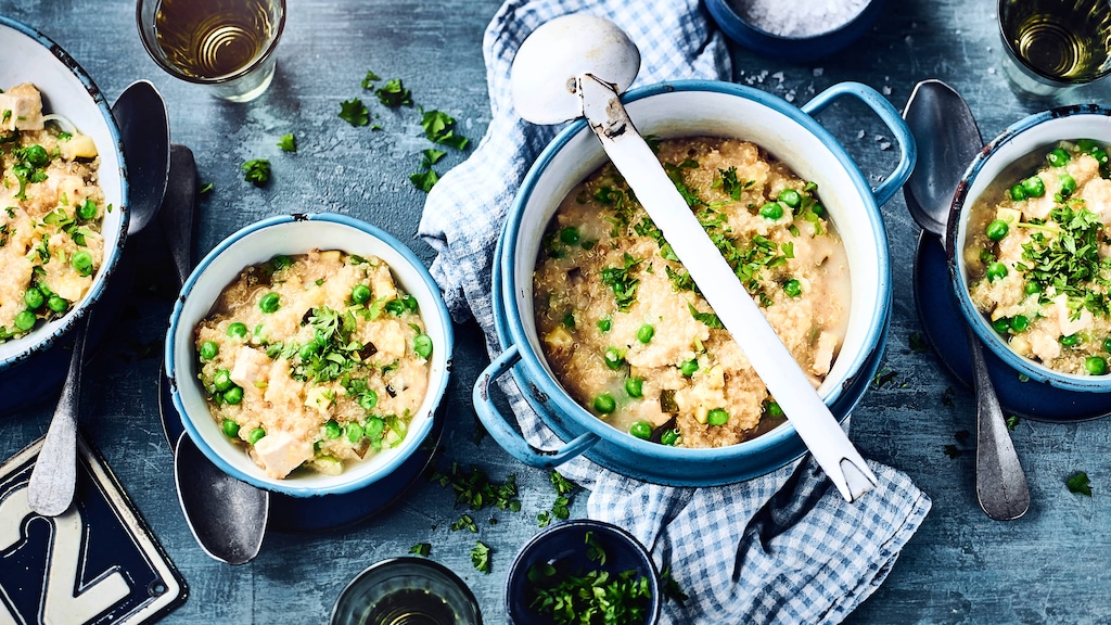 Durch die Kokosmilch wird unser Rezept für One Pot Quinoa mit Zucchini, Erbsen und Kokosmilch lecker cremig und ist ganz schnell gekocht – und das in nur einem Topf.