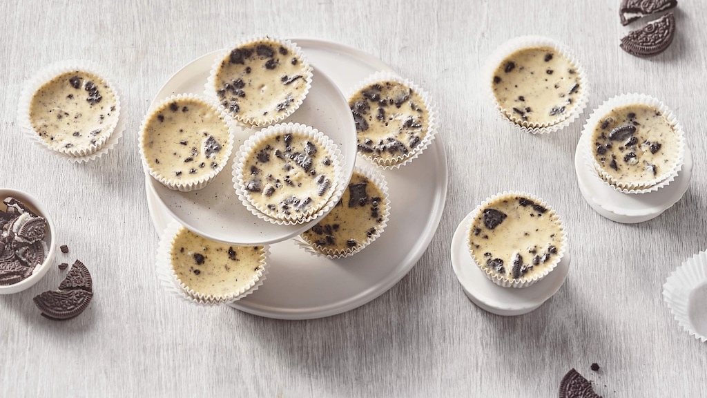 Den Backofen auf 120 Grad Umluft (135 Grad Ober-/Unterhitze) vorheizen. Die Mulden eines Muffinblechs mit Muffinförmchen bestücken und in jedes einen Oreo-Keks hineinlegen.
