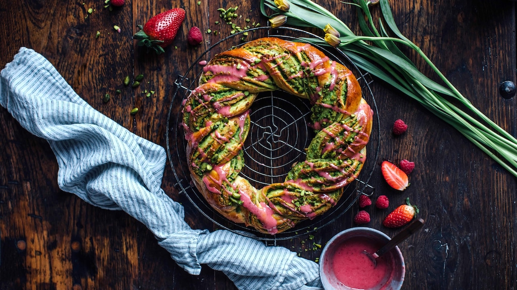Unser Osterkranz mit Pistazienfüllung eignet sich hervorragend für den Osterbrunch mit den Liebsten.