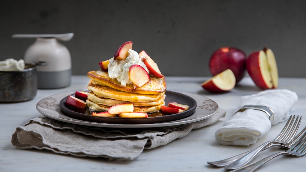 Der American Way of Life bietet zahlreiche süße Genüsse – auch ohne Pancake-Maker. Für unser Rezept genügt die Pfanne. Damit bereiten Sie Pancakes einfach zu und verfeinern sie mit einem Topping aus karamellisierten Äpfeln und Schlagsahne.