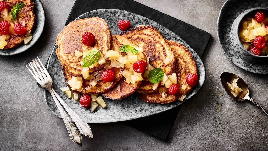 Pancakes anrichten und das Birnen-Himbeerkompott dazu reichen.