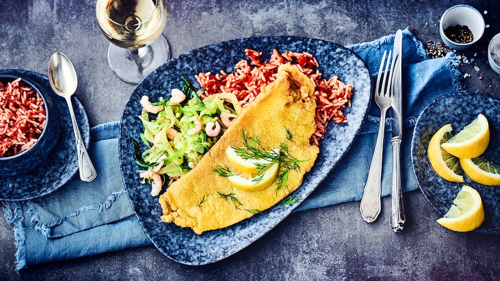 Haben Sie Lust auf ein sommerliches Gericht mit Fisch und Meeresfrüchten? Probieren Sie unser paniertes Schollenfilet an Lauch-Fenchel-Gemüse mit Eismeergarnelen und dazu pikanter Tomatenreis!