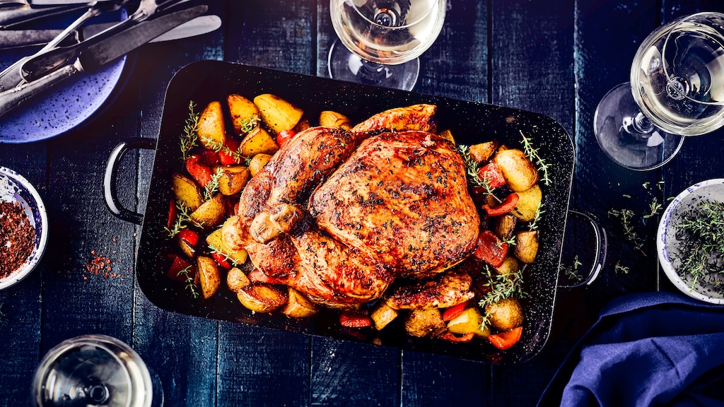 Knusprig, saftig, lecker: Mit unserem einfachen Ofen-Rezept für würziges Paprika-Hähnchen auf gebratenen Kartoffelspalten servieren Sie Ihren Liebsten ein kräftiges und ausgewogenes Gericht für den ganz großen Hunger! Erfahren Sie auch, wie man ein Hähnchen tranchiert.