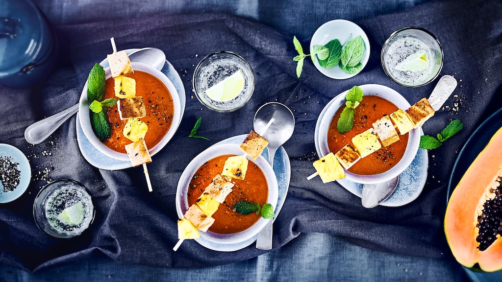 Suchen Sie eine fruchtige Vorspeise ohne Gluten und Laktose? Dann probieren Sie unsere pikante Paprika-Papaya-Suppe mit Tofu-Ananas-Spießen!