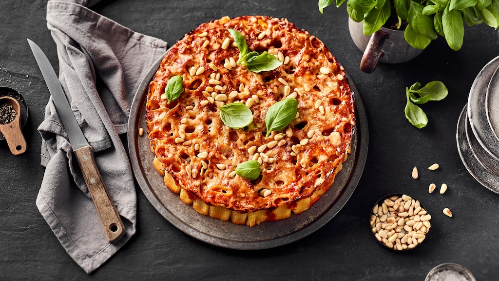 Damit Ihr Pasta-Kuchen gelingt, ist es wichtig, dass Sie die Nudeln nach dem Aufschichten in der Springform komplett mit der Soße bedecken, damit sie im Ofen nicht trocken werden. Am besten eignen sich Nudeln mit Loch in der Mitte, wie Tortiglioni oder Rigatoni für Pasta-Kuchen. Bei unserem Rezept handelt es sich um die vegetarische Variante. Sie können aber auch eine Bolognese-Soße benutzen.
