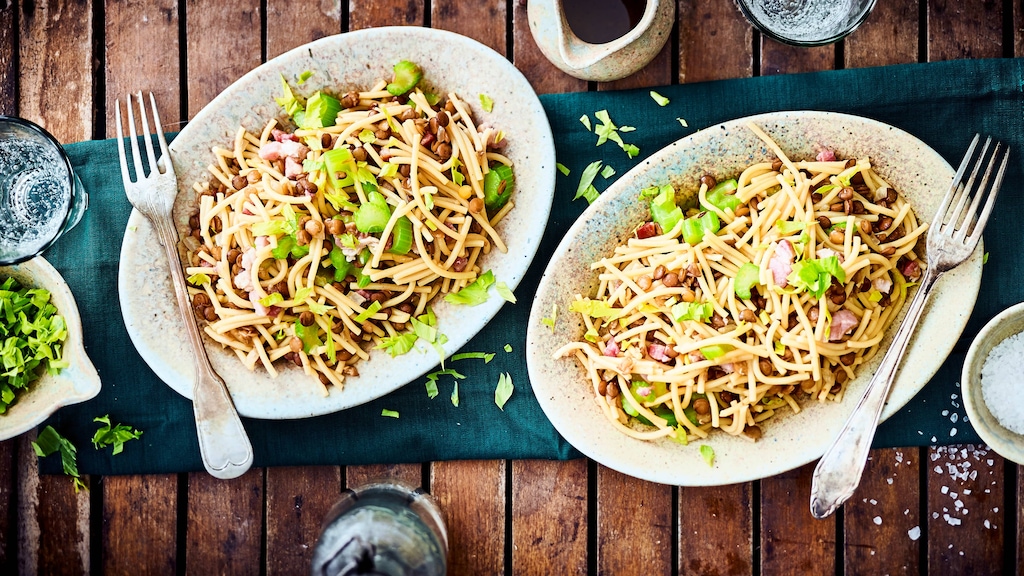 Ein bekanntes Nudelgericht aus Apulien: Entdecken Sie unsere Spaghetti mit Speck, Sellerie, Weißwein und nährstoffreichen braunen Linsen.