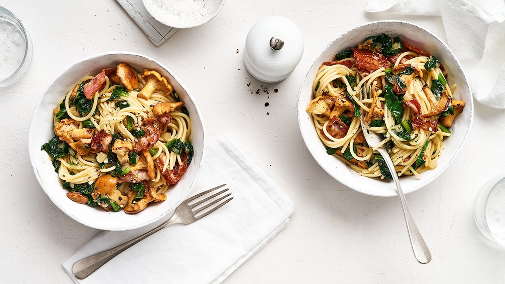 Pasta mit Speck und Pfifferlingen wird schnell und ganz einfach zubereitet. Das bedeutet nicht, dass es im Geschmack einbüßt: Denn Pfifferlinge, Speck und Spinat sorgen zusammen mit Olivenöl für ein Gericht, das im Gedächtnis bleibt.