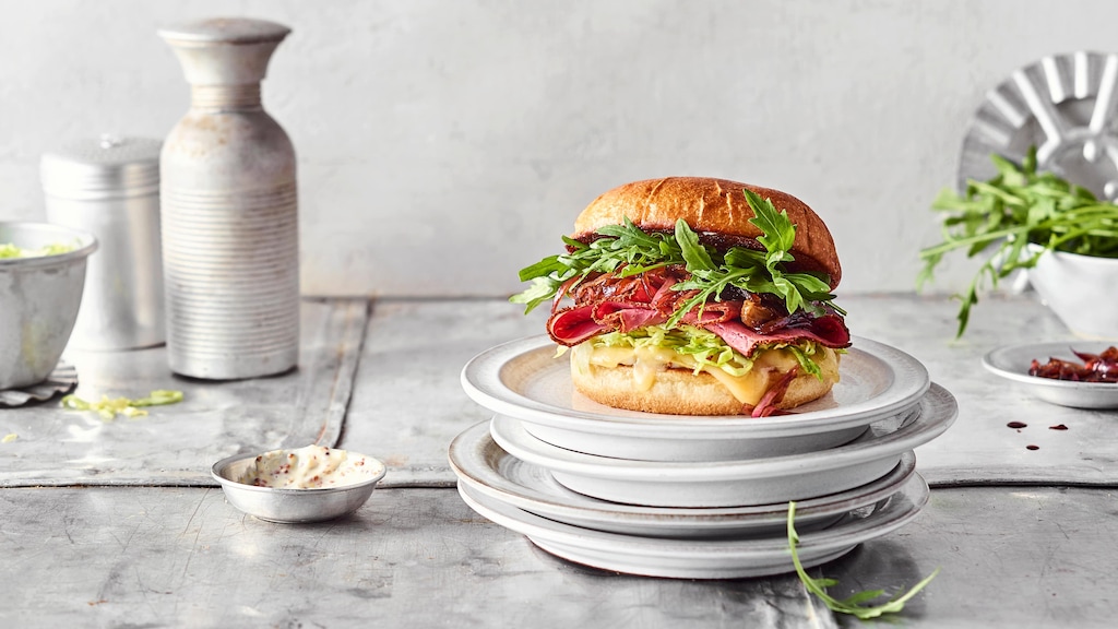 Brioche Buns mit der Honig-Senf-Mayonnaise bestreichen und mit Rucola, Weißkraut, Pastrami, Rotwein-Schalotten und Gruyère belegen. Zuklappen und servieren.