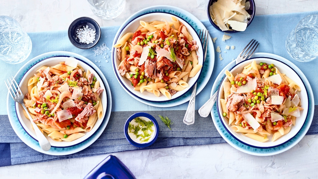 Probieren Sie unser pikantes Pastagericht: Penne mit einer Soße aus Tomaten, Erbsen, Orangensaft und Fenchel mit Thunfischfilet – in 45 Minuten zubereitet!