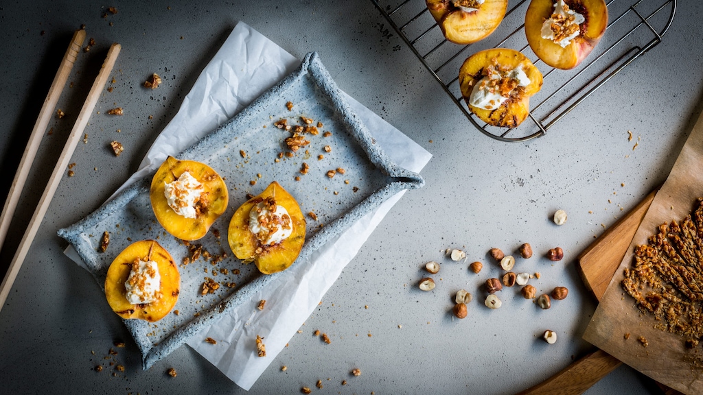 Die Pfirsiche waschen, halbieren und von beiden Seiten kurz auf dem Grill bräunen.