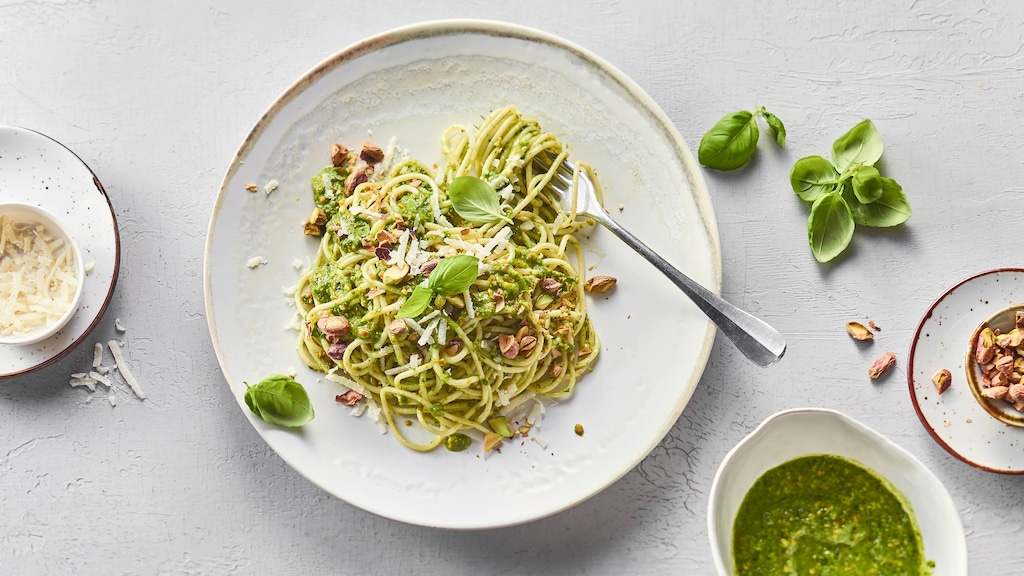 Unser Pistazien-Pesto-Rezept enthält Parmesan als einzige Zutat tierischen Ursprungs. Bevorzugen Sie ein veganes Pesto, können Sie den Käse problemlos weglassen. Die übrigen Komponenten sorgen auch so für einen ausgewogenen Geschmack. Und der passt zu nahezu allem: Nudeln, Fleisch, Brot, Pizza, Pfannkuchen, Salate, Gemüse – verfeinern Sie einfach Ihre Lieblingsspeisen mit der würzigen Soße.