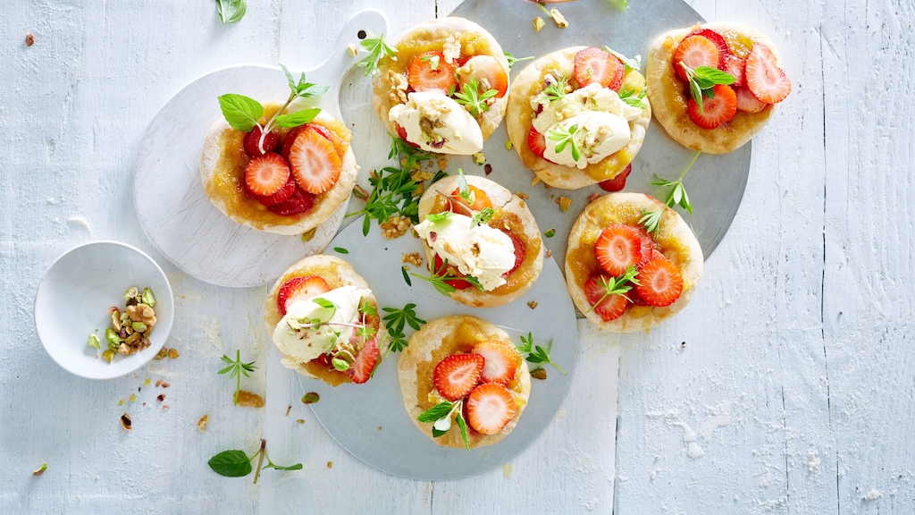 Ofen auf 250 Grad (Umluft) vorheizen. Teigfladen mit der Apfelsoße bestreichen, die Hälfte der Erdbeerscheiben darauf verteilen. Nacheinander im Ofen ca. 10 Minuten backen.