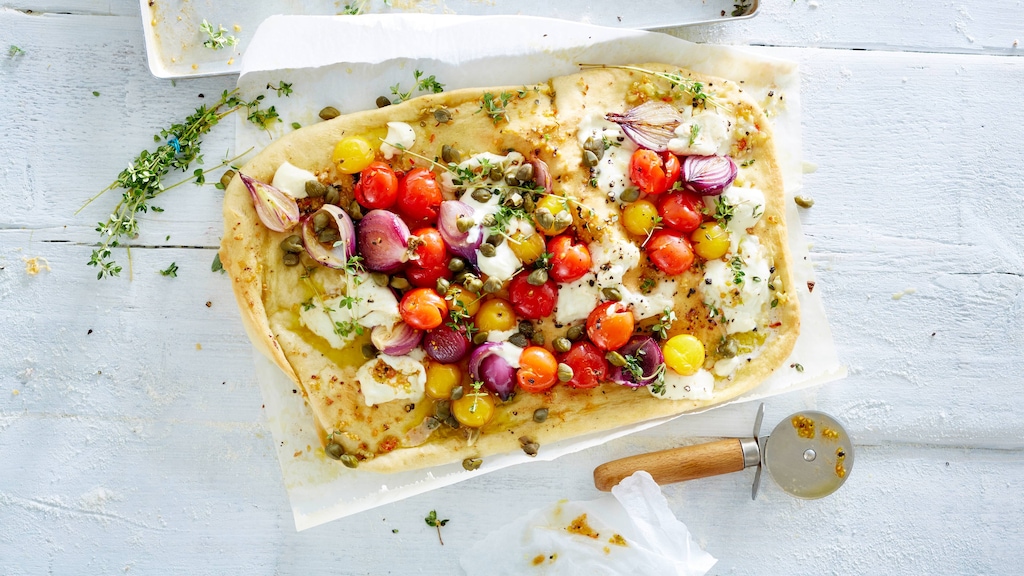 Pizza mit roten Zwiebeln, Tomaten, Mozzarella, Mascarpone und Knoblauch-Chili-Öl.