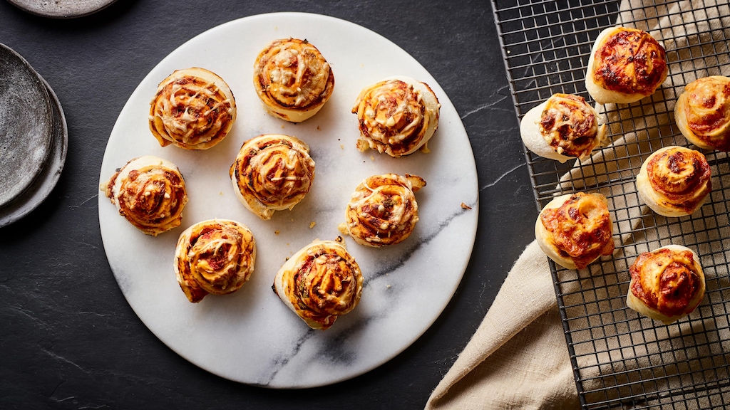 Pizzateige der Länge nach aufrollen und jeweils in 3 cm dicke Scheiben schneiden. Die 24 Pizzaschnecken auf die Bleche verteilen und nacheinander auf der mittleren Schiene für ca. 15 Minuten im Ofen goldbraun backen.