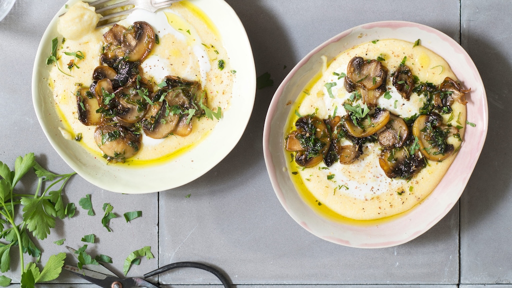 Einfach, schnell und selbstgemacht: Vegetarische Polenta mit gebratenen Pilzen und Petersilie. Probieren Sie es aus!