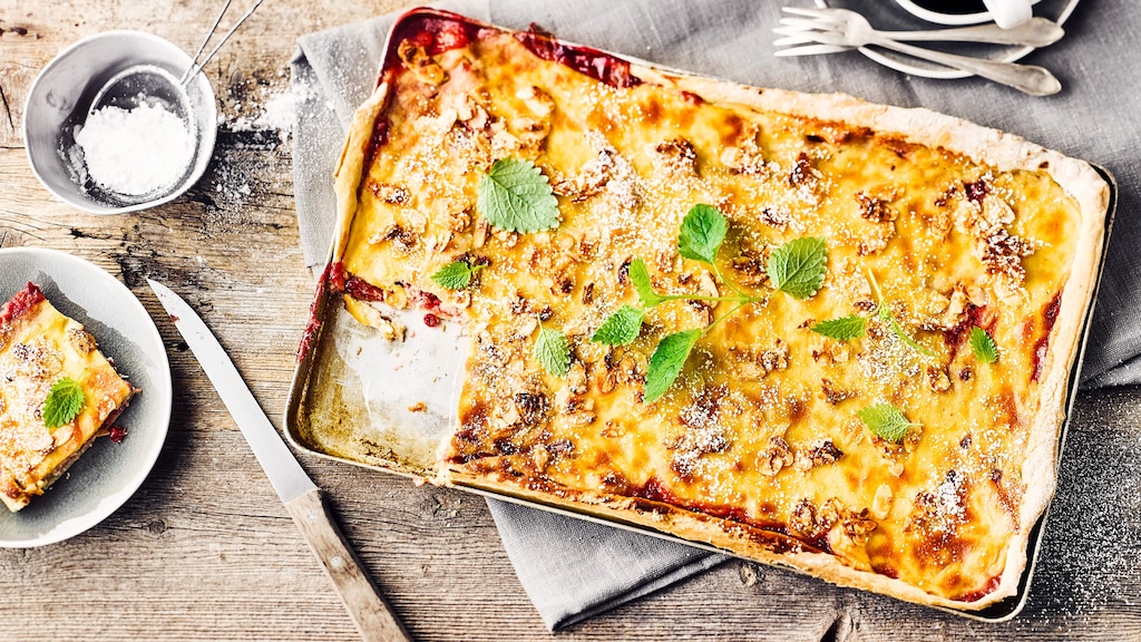 Dieser Kuchen vom Blech ist fast ein Dessert: Süßer Hefeteig belegt mit säuerlichen Preiselbeeren und einer Schicht aus Marzipanpudding bilden eine köstliche Kombination. Probieren Sie unser Rezept für Preiselbeerkuchen aus!