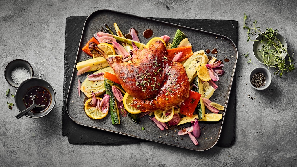 Putenkeulen aus dem Ofen nehmen, das Gemüse nochmals mit Salz und Pfeffer abschmecken und servieren.