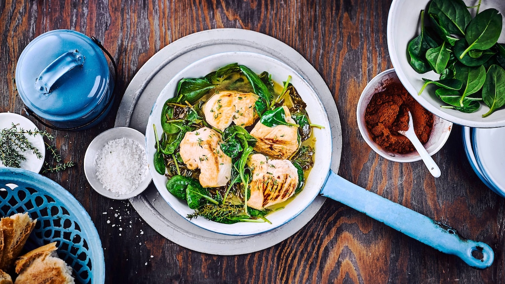 Unsere Putenmedaillons überzeugen mit einer cremigen Sauce aus Wein, Thymian und Babyspinat. Das ist blitzschnell gemacht und absolut köstlich!