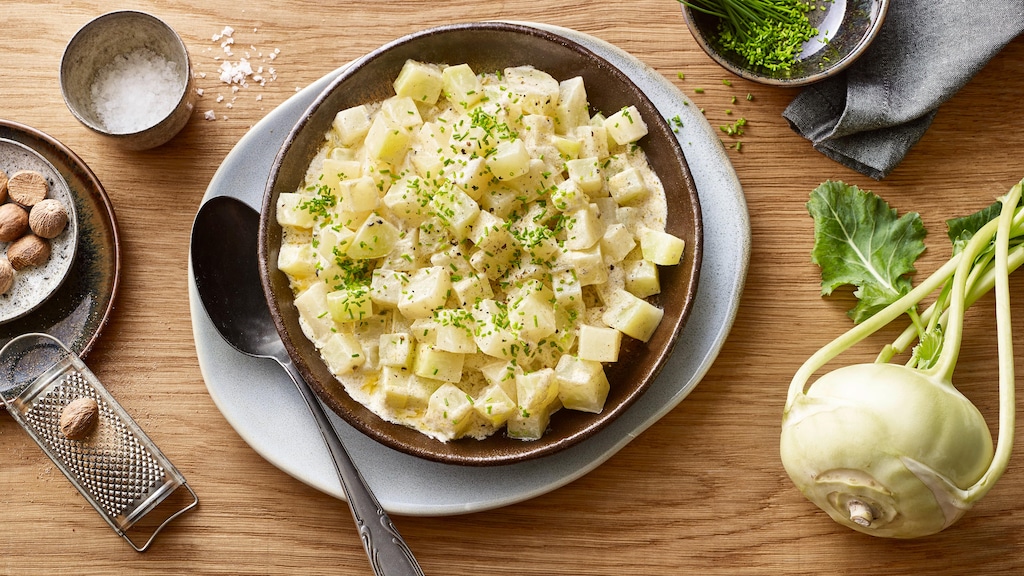 Kohlrabi ist nicht nur sehr lecker, sondern enthält auch wertvolle Vitamine und Mineralstoffe. Übrigens sollten Sie die Blätter auf keinen Fall wegwerfen, sondern mitkochen: In ihnen stecken nämlich besonders viele Nährstoffe. In der Küche lässt sich mit der Stängelrübe – wie der Kohlrabi korrekt heißt – jede Menge anstellen. Neben unserem einfachen Rezept für Rahmkohlrabi finden Sie hier auch Schritt-für-Schritt-Anleitungen für gefüllte Kohlrabi mit Pilzen und für Kohlrabigemüse mit Pinienkernen, Karotten und Basilikum. Probieren Sie es aus und sorgen Sie für Abwechslung zum Mittag- oder Abendessen!