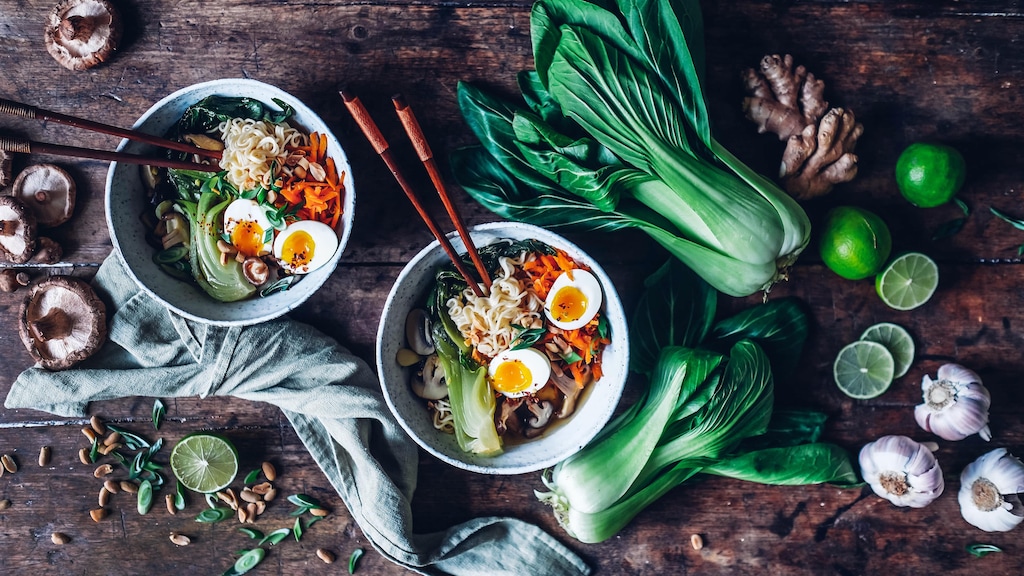 Für unsere vegetarische Ramen Bowl mit Gemüse müssen Sie allerdings nicht weit reisen. Denn für diese moderne Interpretation des japanischen Originals reicht der Gang in Ihre Küche. Hier kombinieren Sie allerhand frisches Gemüse wie Pak Choi und Pilze mit einer Gemüsebrühe. Anschließend köcheln Sie aus typisch asiatischen Geschmacksgebern wie Sojasoße und Reisweinessig eine würzige Ramen-Bowl-Soße, in der Sie die Ramen-Nudeln ziehen lassen. Am Ende kombinieren Sie alles und toppen die Schüssel mit einem Ei. Fertig!