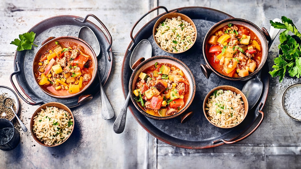 Glutenfreies Mittagsgericht: Ratatouille aus Paprika, Aubergine, Zucchini und Hackfleisch, dazu Naturreis – probieren Sie es aus!