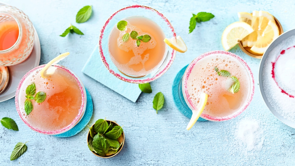 Für die Garnierung den Grenadinesirup in eine tiefe Schale gießen und in eine zweite Schale so viel Zucker, wie der Zuckerrand am Glas hoch sein soll. Drehen Sie die Gläser um und tauchen Sie diese mit dem Rand in den Sirup. Lassen Sie den Sirup abtropfen. Nun tupfen Sie die Gläser in die Schale mit dem Zucker. Schütteln Sie den überflüssigen Zucker ganz vorsichtig ab.
