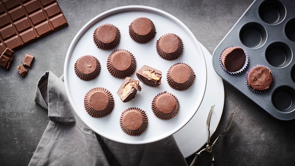 Unser Reeses Cups-Rezept könnte simpler nicht sein: In die Muffinförmchen kommt nichts als Vollmilchschokolade und Erdnussbutter, die Sie mit etwas normaler Butter, ein wenig Puderzucker und einer Prise Salz verfeinern. Verwenden Sie Erdnussmus, erhöhen Sie den Zucker- und Salz-Anteil ein wenig, da diese, anders als bei Erdnussbutter, dem Mus noch nicht vorab zugesetzt sind. 30 Minuten Arbeit, ein bisschen Wartezeit, bis im Gefrierfach alles fest geworden ist – und schon steht dem Genuss nichts mehr im Weg!