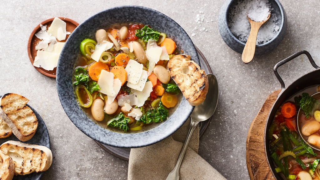 Je nach Rezept werden der Ribollita-Suppe dann noch Kartoffeln, Möhren, Staudensellerie und Zwiebeln hinzugefügt. Vor dem Servieren wird das Ganze mit einem kleinen Schuss Olivenöl angemacht. Nach dem gleichen Prinzip gehen die Italiener und Italienerinnen übrigens bei ihrer Minestrone vor: Auch diese wird vor dem Essen mit dem flüssigen Gold beträufelt.