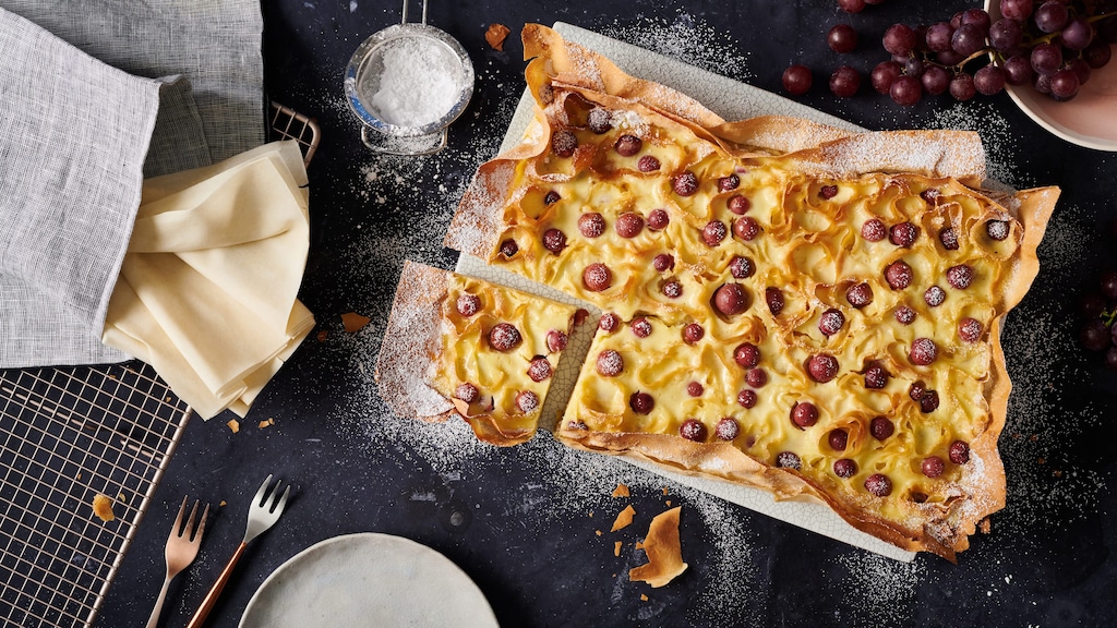 Es ist Kuchenzeit! Und zwar diesmal mit einem ganz besonderen Kuchen: Probieren Sie unser Rezept für einen selbstgemachten Ricotta-Kuchen mit Filoteig und roten Trauben.