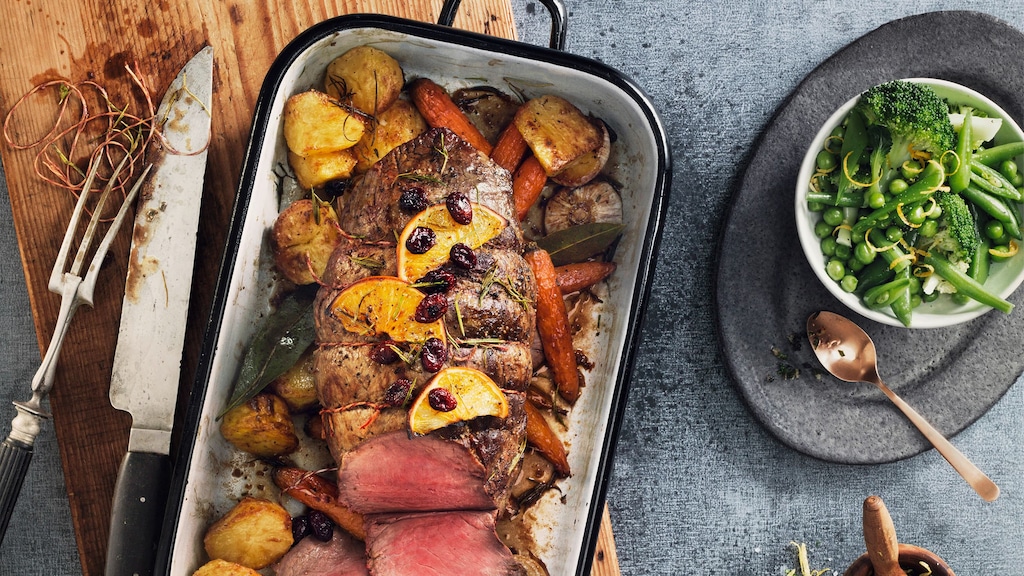 Probieren Sie unser Rezept für Rinderbraten mit Cranberries einmal aus: Mit buntem Ofengemüse, frischen Kräutern und einer leckeren Rotweinsoße!