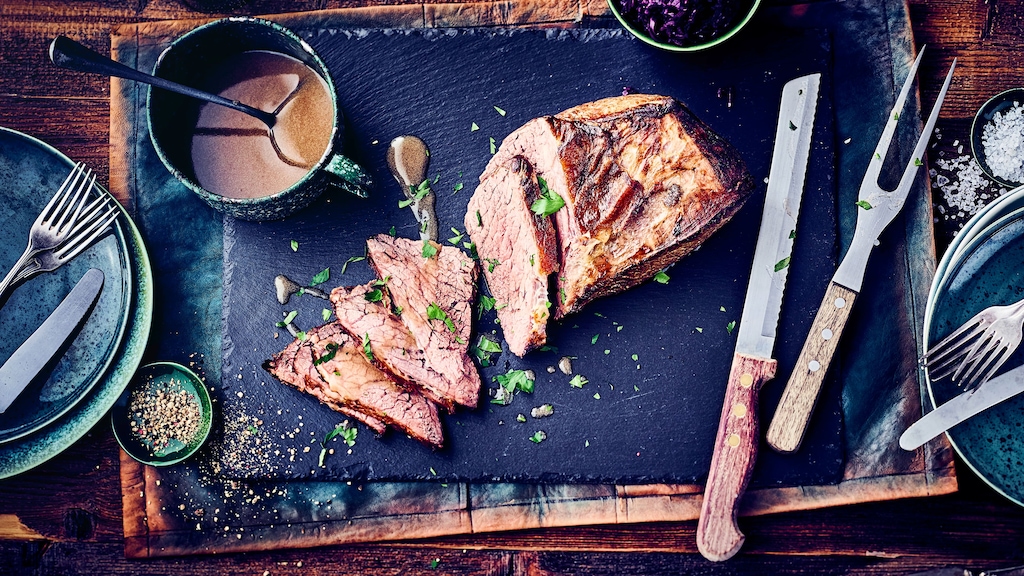 Braten in Scheiben schneiden und auf einer Platte anrichten. Ausgetretender Bratensaft zur Sauce geben. Sauce separat zum Braten reichen.
