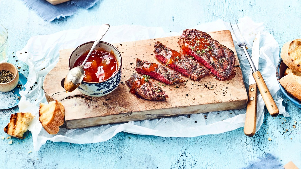 Probieren Sie unser Rezept für gegrillte Rindersteaks einmal aus: Mariniert in Öl, Rosmarin und Thymian und mit gebratenen Zwiebeln und Cocktailtomaten!