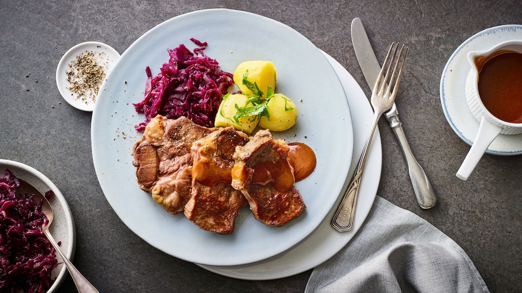 Den Rotkohl, Kartoffeln, sowie die Sauce erwärmen und zusammen mit der gebratenen Rinderzunge servieren.