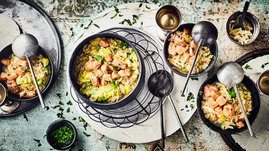 Probieren Sie unser Rezept für ein Risotto mit Parmesan und Lauch an gebratenen Wildlachswürfeln in Weißweinsoße einmal aus – pikant und lecker!