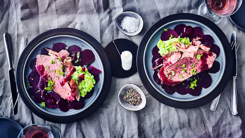 Festliches Gericht: Kochen Sie unser Roastbeef im Salzteig – mit Rote Beete-Scheiben vom Blech und pikantem Kartoffel-Erbsen-Püree!