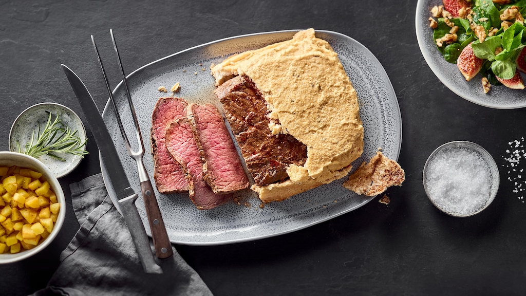 Bereiten Sie ein delikates Roastbeef in Rosmarin-Salzkruste zu und kombinieren Sie es mit einem winterlichen Salat. Ein Genuss für jeden Gaumen!