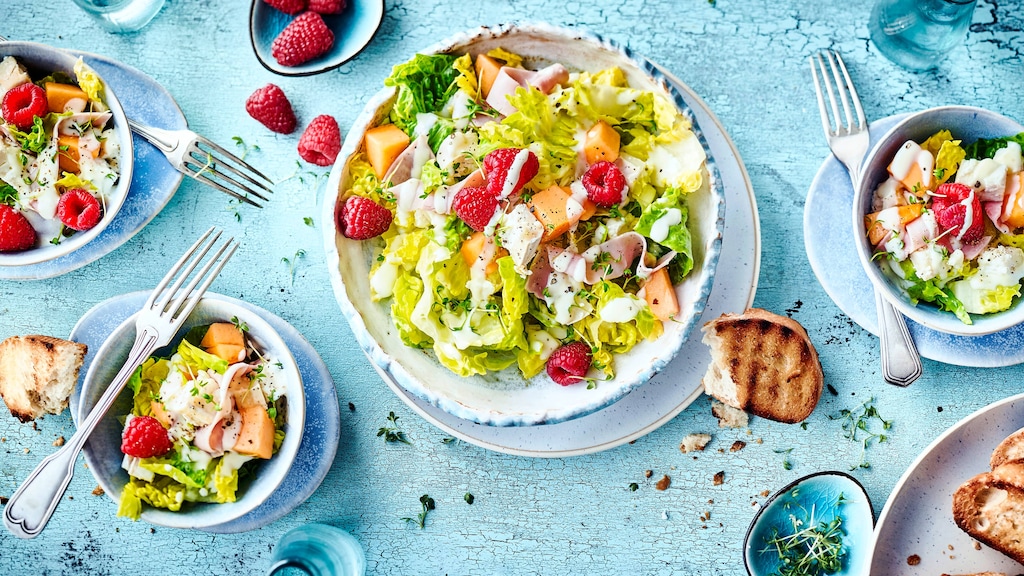Fruchtiger Salat für warme Tage: Probieren Sie unseren Romanasalat mit Honigmelone, Mozzarella und marinierter Gurke – in 10 Minuten servierbereit!