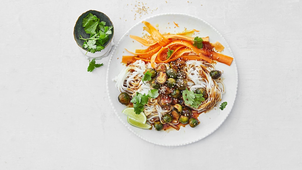 Die kleinen Rosenkohlknospen sind wahre Wunderbälle und ergeben in Kombination mit Karotten und Reisbandnudeln eine leckere Mahlzeit, die nicht schwer im Magen liegt.