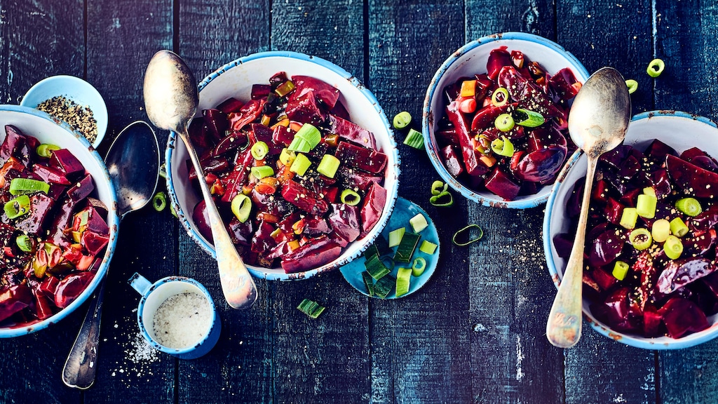 Unser Rezept nutzt das süßliche, leicht erdige Aroma der Knolle und kombiniert es mit einer Soße aus Brühe, Sahne, Salz und Pfeffer sowie mit Frühlingszwiebeln. Das Ergebnis? Eine aromatische Beilage zu Fleisch oder eine nahrhafte Hauptspeise für ein vegetarisches Dinner. Frische Rote Beten erhalten Sie noch mit Haut. Die lösen Sie am besten erst nach dem Kochen. Möchten Sie die Knolle im Backofen garen, wie bei unserem Rezept für Rote-Bete-Salat mit Feta, empfiehlt es sich, diese vorher zu schälen. Um hinterher nicht die Farbe der Rübe für unser Rote-Bete-Gemüse an den Fingern zu haben, können Sie dabei Einweghandschuhe tragen. Alternativ können Sie die Knolle auch bereits geschält und vakuumverpackt kaufen – und daraus z.B. den Rote-Bete-Dip zu unseren Gemüse-Pommes zubereiten. Wie Sie sie auch abseits unseres Rote-Bete-Gemüse-Rezepts in der Küche einsetzen, erklären wir Ihnen hier.