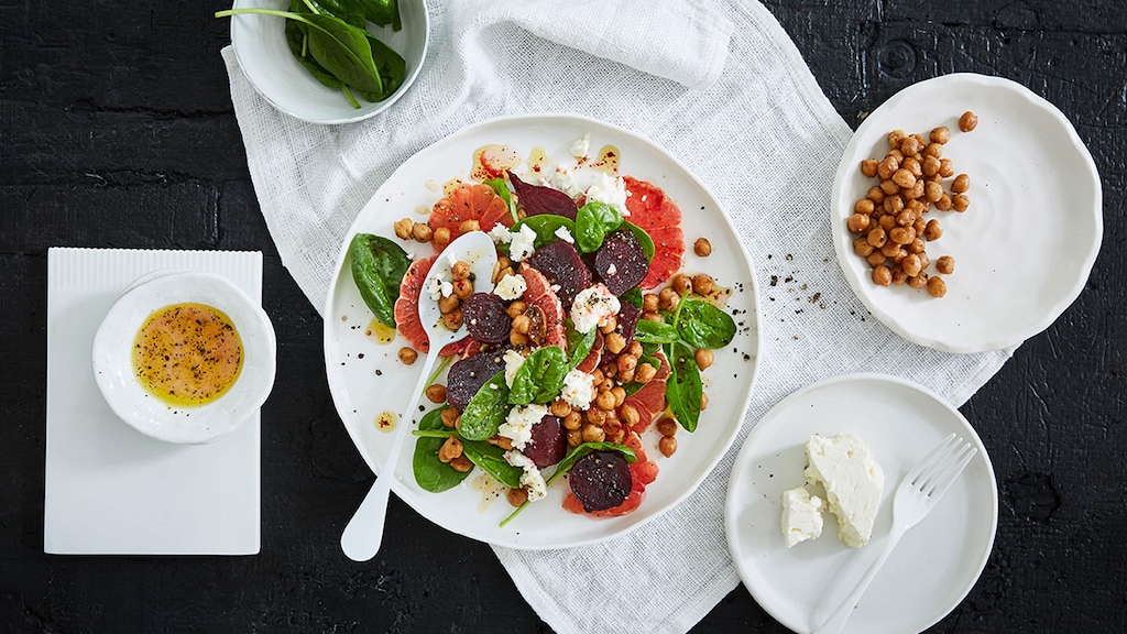 Rote Beten mit Kichererbsen, Spinat und Grapefruit auf Tellern anrichten. Grapefruitsaft mit übrigem Öl (6 EL) verquirlen, mit Salz und Pfeffer würzen. Schafskäse zerbröseln. Salat mit Käse bestreuen und mit Dressing beträufelt servieren.