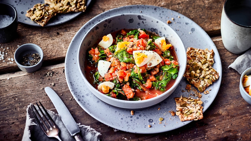 Stiele und Blätter von junger Roter Bete mit Tomaten gedünstet und mit gekochten Eiern serviert.