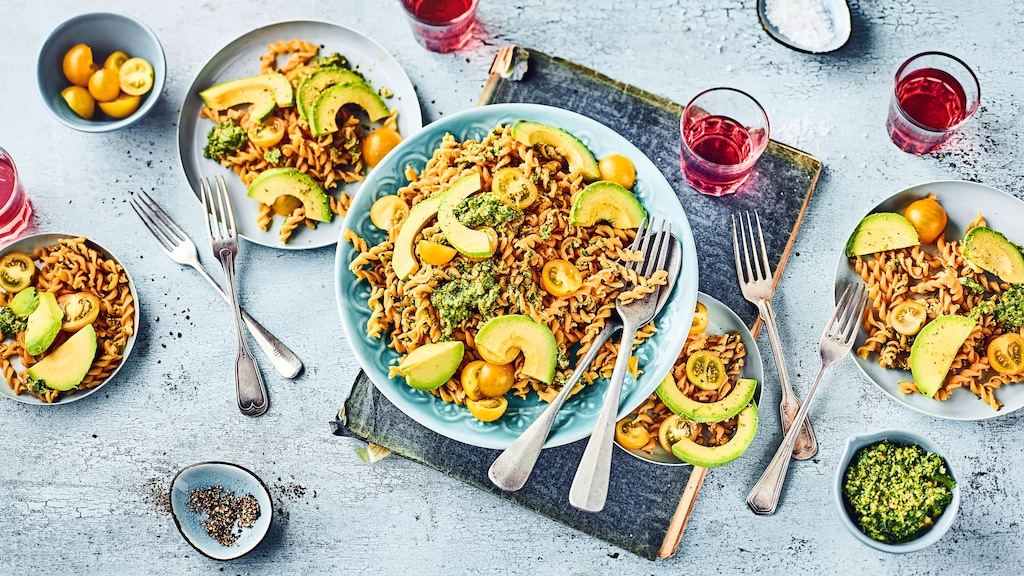 Eine Alternative zu klassischen Nudeln ist Pasta aus Hülsenfrüchten. Zum Beispiel unsere Rote-Linsen-Pasta mit Kräuterpesto, Avocado und Cocktailtomaten.
