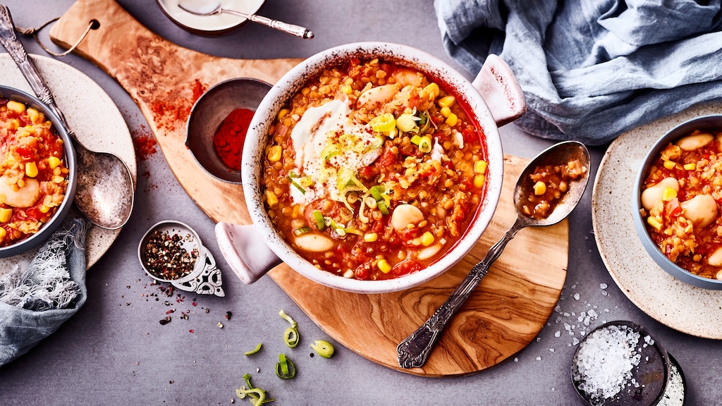 Deftiger Eintopf für die kalte Jahreszeit: Probieren Sie unser Chili mit Paprika, roten Linsen und weißen Bohnen – fertig in nur 15 Minuten!