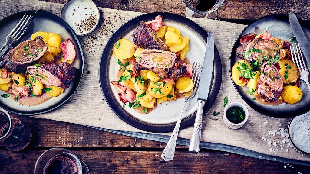 Rouladen mit einer klassischen Füllung aus Speck, Gurken und Zwiebeln, dazu als Beilage knusprig gebratene Kartoffeln.